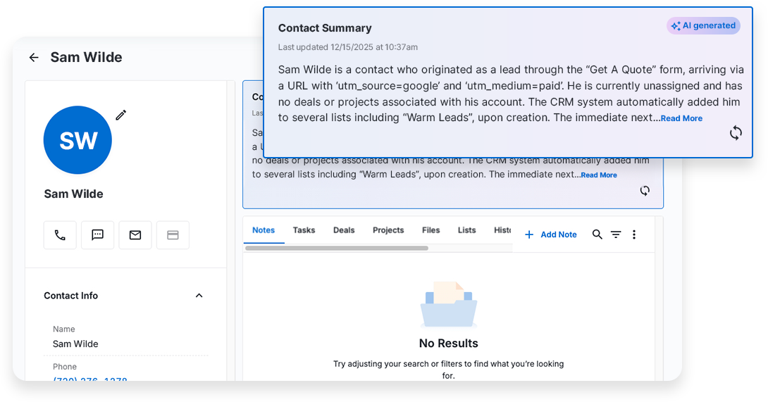 Comprehensive Data Snapshot: The summary pulls from CRM data, including custom fields, notes, deals, projects, lists, history, and original UTM data.
