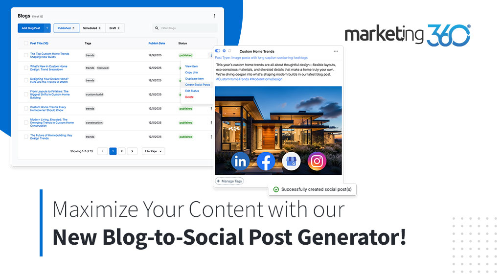 You’re busy running your business. You shouldn’t have to worry about constantly creating new content for every social platform. We get it. That’s why we’re thrilled to introduce the Blog-to-Social Post Generator in your Marketing 360® Blogs Collection.